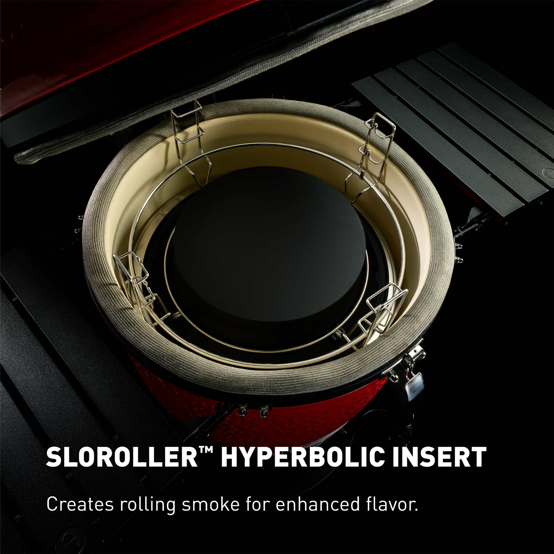 It includes the revolutionary SloRoller Hyperbolic Smoke Chamber insert, which harnesses the power of cyclonic airflow technology to control heat and smoke while delivering the great taste and texture that only a ceramic bbq grill can provide.